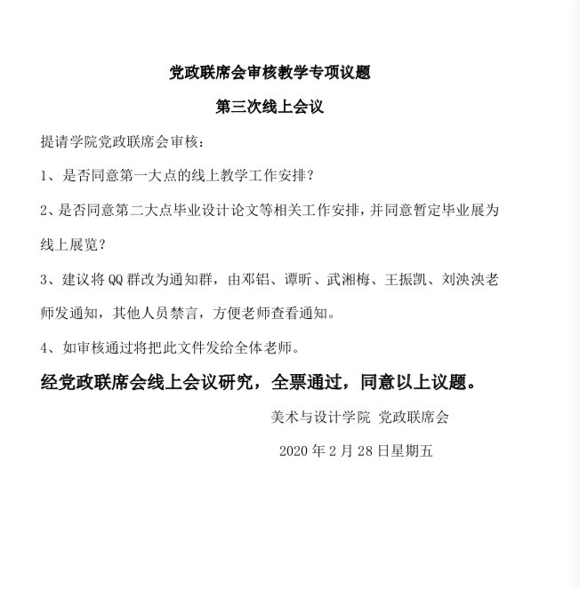 2020年2月15日至3月6日,yl6809永利分别在线上召开四次教学专项党政联席会议,审议教学负责人提交了《yl6809永利疫情防控期间在线教学与组织管理工作方案》、《公司教师线上教学实施与课程建设一览表》、《yl6809永利线上教学督导计划》等文件,明确“以课程组为单位,教学方式灵活多样,平台选择以简单易操作,保障教学为主”的工作思路。审定了全院教师、所有课程的线上教学初步计划,选用平台情况等。要求课程组内统一教学方式,课程组负责人负责填报实施情况,相同课程同平台上课,同头课教团队源互享,协同工作模式。确定了开学前试课工作安排;线上教学督导方案;教学材料要求;毕业论文实施方法;毕业作品展的调整等。从宏观到微观,层层细化,逐步落实了公司线上教学的具体工作,为公司线上教学的顺利实施奠定了基础。