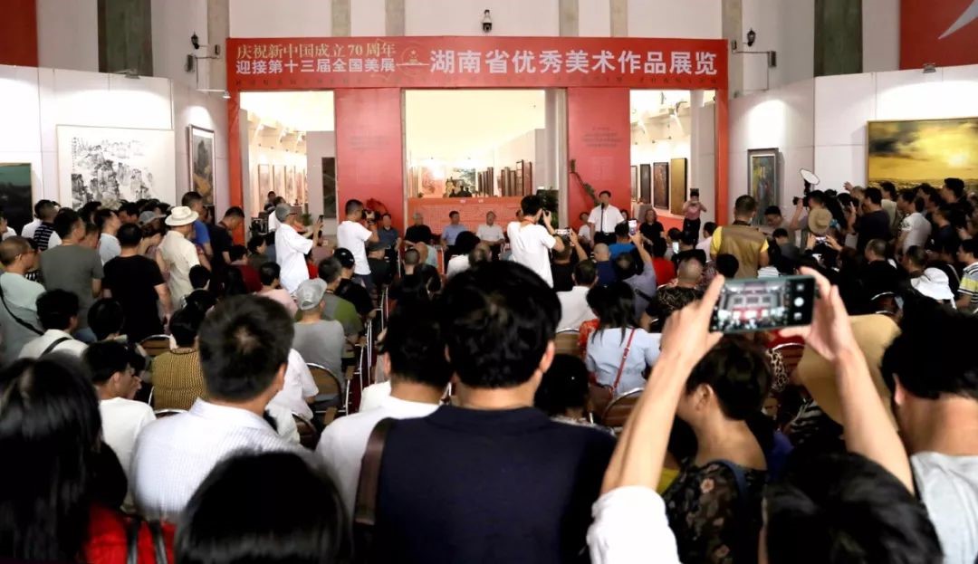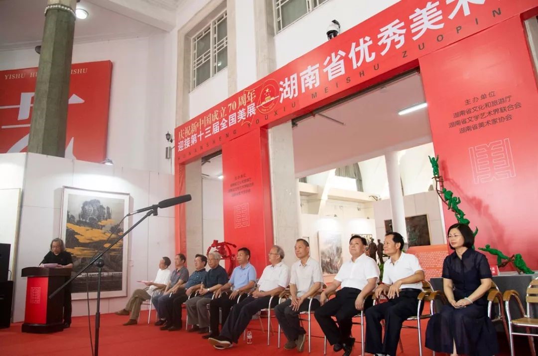 2019年7月23日,由湖南省文化和旅游厅、湖南省文学艺术界联合会、湖南省美术家协会联合主办的“庆祝新中国成立70周年 迎接第十三届全国美展——湖南省优秀美术作品展览”在湖南省展览馆开幕。湖南省政协原副主席、省文联主席欧阳斌宣布展览开幕。第十三届全国美术作品展览是由中华人民共和国文化部、中国文学艺术界联合会、中国美术家协会联合举办的权威性、综合性的国家级大展,每五年举办一次,形式多样,规格之高,堪称美术界的“奥运盛会”。中国美协水彩画名誉主任、湖南省美协名誉主席黄铁山认为,湖南美术家们深入生活,以人民为中心,创作出了大量的优秀作品,这次展览也是对湖南美术的大检阅,希望全省奋斗在创作一线的老中青艺术家们,以这次展览为起点,更好地深入生活,更努力地投入到美术创作中去,使湖南美术走上一个新的台阶。湖南省文化和旅游厅副厅长、湖南省书协主席鄢福初表示,让人民群众过上美好生活,满足人民群众的精神文化需求,是当代所有美术人的责任。希望通过此次展览全面检阅湖南美术的创作成果,培养和发现新人、创作精品力作,为湖南文化建设贡献新的力量。