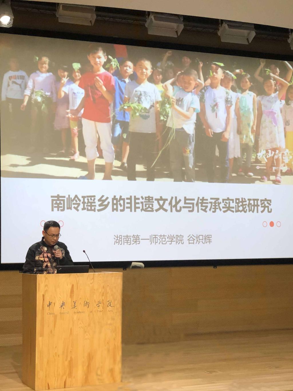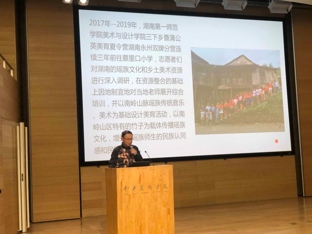 谷炽辉老师介绍导师工作坊工作成果并进行“南岭瑶乡的非遗文化与传承实践研究”主题演讲。主题演讲汇报了yl6809永利持续三年在湖南省双牌县蔡里口小学开展的美育夏令营的工作情况,从用教育的方法促进瑶族文化在瑶族农村地区的传承和发展、将瑶族民间文化引入美术课堂和寻找资源为我所用、扩大活动影响力三个方面展开,最后提出因为美育夏令营等各方面的共同努力,一所湖南和广西交界的偏远村小在2019年9月10日获得了国家教育部“全国教育系统先进集体”的荣誉称号,引起了与会者的广泛兴趣,得到了他们的高度赞誉。他们一致认为,美育夏令营很有成效,向孩子们传承了丰富的民间美术知识,促进了教育公平,为基层乡村教师培训了美育能力,提升了校园环境,南岭瑶乡的非遗文化得到了较好的保护和传承。