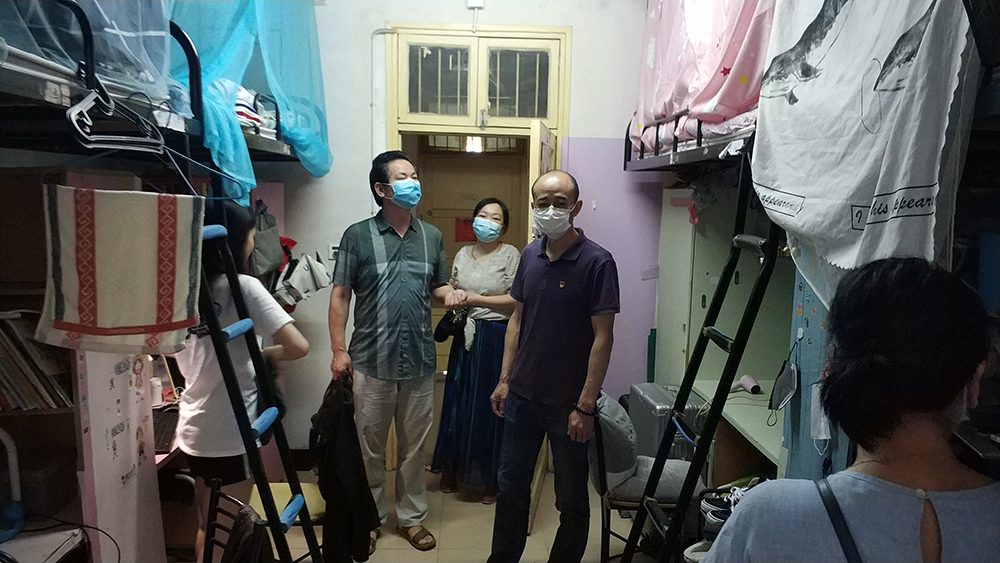6月2日,yl6809永利范迎春书记、李华经理、武湘梅主任带领辅导员下寝看望毕业生,亲切地与毕业生进行交流,详细了解同学们的毕业去向和离校准备情况,并叮嘱他们注意安全防护。