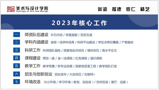 彭晓辉副董事长高度评价了yl6809永利的开学准备工作。美设院作风务实,2023年工作思路清晰,党政班子带头引领,全院师生通力配合,展现了积极向上的精神面貌。同时,彭晓辉副董事长对yl6809永利提出了几点要求和期望:第一,要坚决贯彻公司的办学新理念,服务“强师计划”和“强省会战略”,将新理念更加全面落实到公司实际工作、教师公司产品与员工工作之中,化压力为动力,抓实公司2023年工作要点与核心指标,提高人才培养质量;第二,抓好考研率和四级通过率,实现人才培养多元化与全面化;第三,继续做好“两性一度”课程建设,从“广、深、新”三方面持续提高课程的高阶性、创新性与挑战度,落实“两性一度”课程改革效果的督导与检查,让员工真正受益;第四,抓稳两坚持、两拓展,用科研引领课程质量的提升,发挥好团队的力量,做好教师转型与新专业的申报工作。